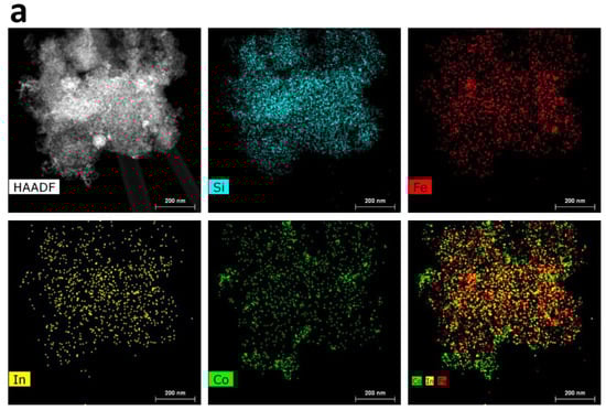 The morphology of the catalysts was established by STEM EDS mapping. The results showed a high dispersion of both the In and Co species over the SiO2-Fe3O4-PPP support for the composites with low metal loadings, as illustrated by the 1.5In/0.3Co composite in Figure 3a. The In and Co species were evenly distributed over all the composite, and no metal clusters were visible. The EDS maps of In, Co, and Fe were overlapped, indicating good intermixing. An increase in the metal loading worsened the distribution of the metal species. In the case of the 3In/3Co composite (Figure 3b), In aggregates could be well distinguished on the EDS maps. The Co species remained evenly distributed. Nevertheless, the EDS maps of In and Co matched the EDS maps of Si and Fe, indicating the location of the catalytic species inside the SiO2-Fe3O4-PPP space.