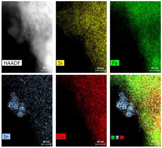 STEM dark-field image and EDS maps of Si, Fe, In, and Co and their superpositions of 1.5In/0.3Co without the polymer layer after the catalytic experiments.