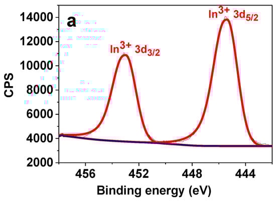 The surface chemical state of the catalysts was investigated by XPS. The survey spectra are presented in Figure S8, from which the presence of all the constituent elements can be identified. Figure 6a shows the HR XPS spectrum of In 3d for the 1.5In/0.3Co catalyst, which is deconvoluted into two peaks with binding energies of 445.4 and 452.9 eV for In 3d5/2 and In 3d3/2, respectively, corresponding to the In2O3 state [45]. An increase in In loading as well as the absence of a polymer layer did not affect the chemical state of In (Figure S9). The HR XPS spectrum of Co 2p of the 1.5In/0.3Co catalyst revealed that the Co was present in the oxidized state (Figure 6b). The peaks with binding energies of 781.5 and 796.9 eV were attributed to the Co 2p3/2 and Co 2p1/2 of Co3O4 [46]. Similar results were obtained for the other catalytic composites synthesized (Figure S10).
