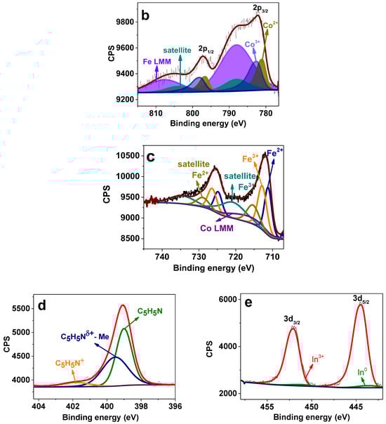 HR XPS spectra of the 1.5In/0.3Co catalyst in In 3d (a), Co 2p (b), Fe 2p (c), and N 1s (d) regions, and HR XPS spectrum of In 3d (e) of the 1.5In/0.3Co catalyst without PPP after the catalytic experiments.