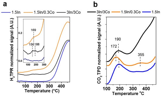 H2 TPR (a) and CO2 TPD (b) profiles of the 1.5In, 1.5In/0.3Co, and 3In/3Co catalysts. (a) contains built-in enlarge image of area 100–300 °C.