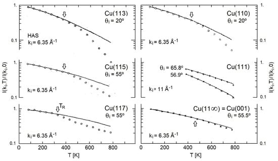 A selection of HAS specular reflectivity data measured by Lapujoulade et al. [43,44] as a function of the surface temperature for the vicinal surfaces of copper (11α), with α = 3, 5, 7, is reproduced in Figure 2 (left panel) and compared with the data for the low-index surfaces (110), (111) and (001) (α = 0, 1, ∞) (right panel). The reflectivity data, normalized to the extrapolated zero-temperature value I(ki, 0), were plotted on a logarithmic scale so as to give the temperature dependence of the DW exponent, with the corresponding He beam incident wave vectors ki and angles θi indicated in the panels. The HAS experimental points were fitted by Lapujoulade et al. (full lines) [43,44] with a theory for the DW temperature dependence based on a He-atom surface phenomenological potential. The surface dynamics were described by a surface Debye temperature of the order of 230 K and additional adjustable parameters to account for the Beeby correction, for the so-called Armand effect, and for anharmonic corrections. The latter correction accounts for high-temperature deviations from the expected linearity.