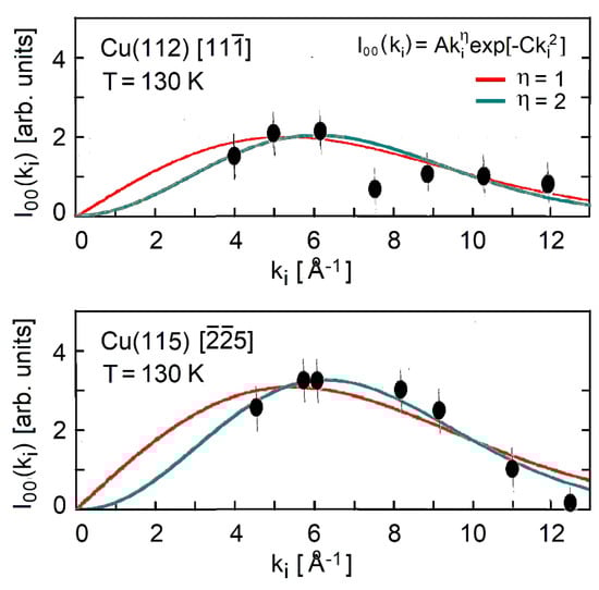 where the exponential represents the DW factor, and A and C are two fitting constants. For the (112) surface, the dip in intensity at ki = 7.5 Å−1 was presumably due to a bound-state resonance and did not allow to clearly distinguish between the fits with the two values of η and the respective values of ki,max. The fittings in Figure 3 for the Cu(115) surface suggested η = 2 with a maximum at Å−1 rather than η = 1 with Å−1.