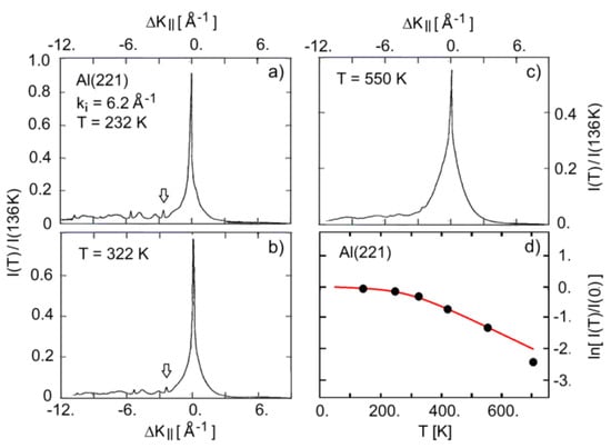 The scattered HAS intensity at a total angle of = 91.5° was measured for the vicinal surfaces Al(221) [47,54,55] and Al(332) [47,48,55], as a function of both the surface temperature and the incident wave vector. Figure 4a–c reproduces some of the HAS angular distributions from the Al(221) surface measured by Witte et al. [54,55] at three different surface temperatures and given an incident wave vector ki = 6.2 Å−1. They were plotted as functions of the parallel wave vector change ΔK|| in the direction normal to the steps. Specular scattering from the crystallographic surface occurred at ΔK|| = 0, while specular scattering from the terraces occurred at about ±2.4 Å−1, the sign corresponding to either the up-hill or down-hill scattering configuration. Panel (d) shows the DW exponent derived from the full set of data points reported by Witte et al. and a fit (red full line), where θD = 790 K is the aluminum Debye temperature [58]. The corresponding λHAS from Equation (2) and the parameters listed in Table 1, when referred to the approximate linear behavior in the temperature interval 232–550 K, was 0.71. The experimental point at 712 K clearly deviated from the fitting curve, with the larger DW slope in the high-T range giving λHAS = 1.33. Such a large increase above 550 K could be interpreted as an effect of surface roughening, similar to what observed for Cu(11α). Clearly, more measurements in this range should be made available in order to confirm this interpretation.