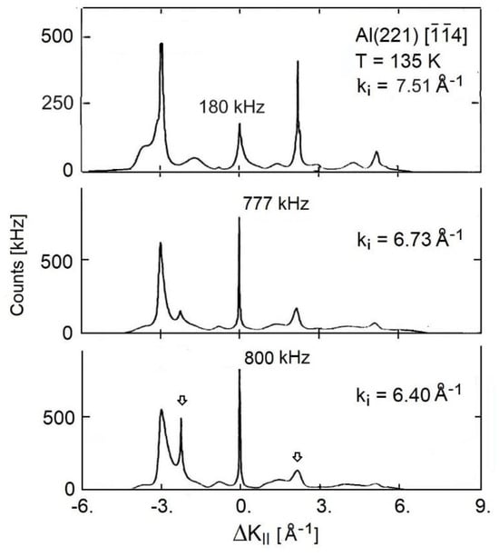 HAS angular distributions from the Al(221) surface at the surface temperature of 135 K for three different incident wave vectors ki as functions of the parallel wave vector change ΔK|| in the direction normal to the steps (adapted from [48]). The exponential drop of the specular intensity (ΔK|| = 0) at larger ki (see Equation (6)) is evident at ki = 7.51 Å−1 (top panel). The maximum specular intensity was found at ki,max ≅ 6.5 Å−1. The arrows in the lowest panel indicate the positions of possible features from either up-hill (positive ΔK||) or down-hill (negative ΔK||) terrace specular scattering.