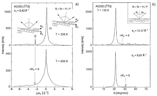 HAS angular distributions from Al(332) along the direction normal to the steps in the up-hill orientation (adapted from Lock et al. [47,48]). (a) The results at two different surface temperatures (302 K and 605 K) and a given incident wave vector ki = 6.62 Å−1. (b) The results for different incident wave vectors (ki = 10.37 and 6.61 Å−1) at a given surface temperature of 130 K. The insets in (a) show the up-hill scattering configuration, either specular with respect to the (332) surface (left side) and yielding a small elastic peak, or specular with respect to the (111) terraces (right side), and yielding a strong elastic peak. The inset in (b) illustrates the up-hill scattering configuration from the vicinal surface (113) with a total scattering angle of 91.5°. The large peaks were derived from terrace scattering, while the scattering from the (332) surface (ΔK|| = 0) yielded very small peaks.