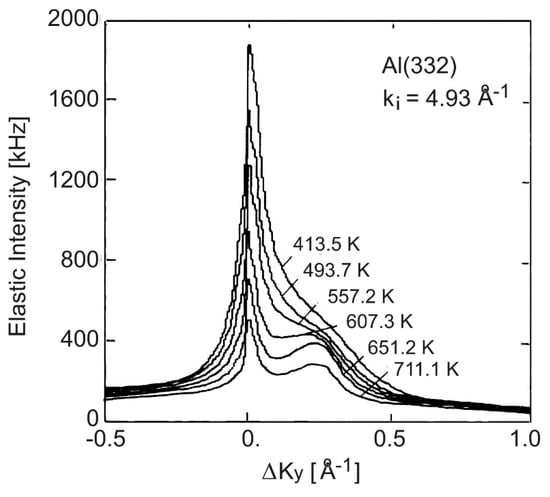 Figure 7, adapted from Lock et al. [47,48], illustrates a problem inherent in determining el–ph mass enhancement factors from stepped surfaces. The temperature dependence of the angular distributions from Al(223) terraces in Figure 7 could hardly be used to extract λHAS due to the partial superposition of an additional peak growing with increasing temperature at positive values of . This was attributed to a temperature-driven instability towards faceting at the steps. Nevertheless, the value of λHAS = 0.66 obtained from Equation (2) in the lowest temperature interval (413.5–493.7 K) (see Table 1, third row for Al(332)), where the specular scattering intensity from the (111) terraces was still dominant, was consistent with the terrace values derived from Figure 6. At higher temperatures, where faceting instability occurs, it can make sense to consider the areas of the double peak features and to determine the logarithm of the ratio of two areas measured at two different temperatures in order to obtain overall qualitative information on the electron–phonon interaction. The fourth entry under Al(332) in Table 1 shows a comparatively large value of λHAS = 1.42 obtained in this way over the entire 414–711 K temperature range. This is consistent with λHAS = 1.33 found at similar high temperatures for Al(221). The large values of λHAS were attributed to a roughening transition, in analogy to what was reported for copper vicinal surfaces.