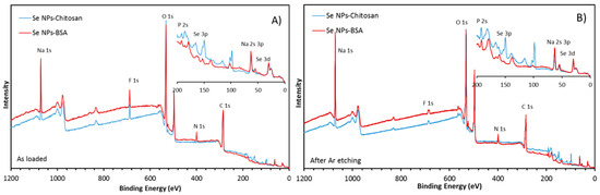 Survey scans of the as-prepared SeNPs-Chitosan and SeNPs-BSA. The inset shows the 0 eV to 200 eV region in more detail: (A) as loaded, (B) after Ar cluster etching. The core levels of interest have been labelled.