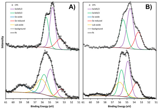 XPS scan of the Se 3D core levels of the SeNPs-Chitosan and SeNPs-BSA (A) before Ar etching and (B) after Ar etching, showing the different chemical states.