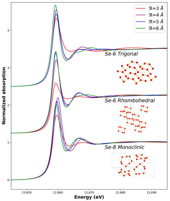 We first tested our measurement and calculation procedures by measuring and simulating the XANES of both the Se0 red and Se0 grey allotropes. Initial structures for the calculations were taken from the literature (Table S1). The optimum adjustment is shown in Figure 4 while the influence of the cluster size (radius ) on the calculated spectra is shown in Figure 5. We managed to reproduce the main features of the Se0 experimental XANES spectra with the calculations in term of the positions of the transitions and bumps after the main line (the so-called white line). The optimum radius for the cluster size was found to be = 5 Å in both cases. A higher radius does not induce further significant changes for the monoclinic calculation, while it decreases the quality of the adjustment for the trigonal calculation when compared to the Se0 grey experimental spectrum. Indeed, the rigid structure used for the calculation does not take into account the distribution of distances and angles between the Se-6-chains and Se-8-rings or the possible conformations inside the sample like in amorphous red selenium [38] Another point is that for all the possible structures, when decreased, the white-line intensity decreased, and the features around 12,665–12,675 eV were less marked (Figure 5).