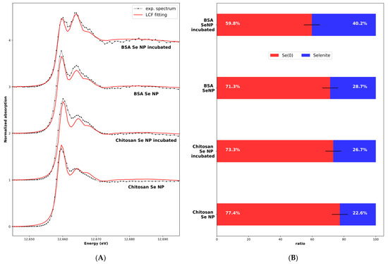 (A) Experimental and least-square-fitting-calculated spectra of SeNPs-BSA or -Chitosan, as-obtained and incubated for 24 h. The calculated Se0 XANES spectrum (corresponding to the monoclinic structure and a cluster size of ) and experimental selenite XANES spectrum (sample: 1% selenite aqueous solution) were used for the LCF fitting. (B) Se0 and selenite ratio, estimated from the LCF. Error bar: 5%.