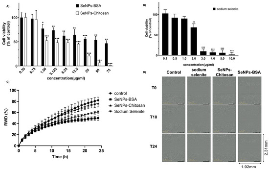 Effect of selenium compounds on PC-3 cells: (A) Effect of SeNPs-BSA and SeNPs-Chitosan on cell viability; (B) effect of sodium selenite on cell viability. Cells were cultured in the presence of increasing concentrations of each selenium compound. After 24 h, MTT assay was performed to measure cellular viability. Values are expressed in percentages as the means ± SDs of at least three separate experiments. *—statistically significant vs. control at p < 0.05. **—statistically significant vs. control at p < 0.01. ***—statistically significant vs. control at p < 0.001. (C) Wound healing ability of PC-3 cells treated with different IC20 concentrations of selenium nanoparticles (SeNPs-BSA and SeNPs-Chitosan) and sodium selenite using the IncuCyte live cell workstation and wound scratch assay. This presents the average relative wound density (RWD in %) from n = 5 identically prepared experimental replicates, and the error bars in (C) indicate one standard deviation from the mean. Representative wound healing assays using (D) PC3-cells at time 0, 10, and 24 h are shown. Selenium compounds (0 µg/mL) were used as the controls. Magnification: ×10; see Figure S2 for details.