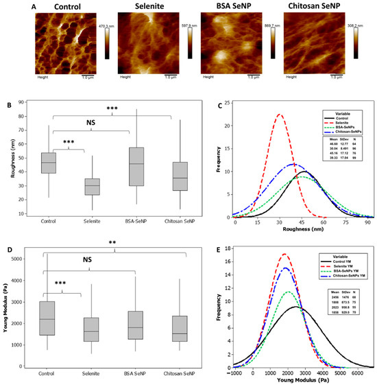 SeNP effect on prostate cancer cells’ (PC-3) close topography, surface roughness, and stiffness. Statistical significance was determined using the Mann–Whitney test with the following used symbols: NS = p > 0.05, ** p < 0.01, and *** p < 0.001.