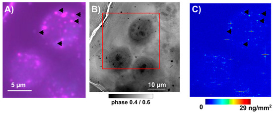 We had the possibility to test, on PC-3 cells treated with SeNPs-BSA, a recent experimental facility, i.e., cryo-optical correlative microscopy. The same frozen–hydrated cells could be imaged in optical fluorescence with a prior labeling of organelles—herein, Lysosomes using a live cell fluorescent probe Lysosomes-RFP CellLight™, BacMam 2.0 ((Thermo Fisher Scientific, Waltham, MA, USA), overnight incubation prior to the 24 h SeNPs treatment, followed by the plunge-freezing procedure). The very same cells could be imaged using a cryo-XRF nanoprobe (Figure 11 and Figure S4). These preliminary data support, at least in the case of the SeNPs-Chitosan treatment, that hotspots of Se in the cell correlate with the positions of the lysosomes. This was expected, as it is widely accepted that endocytosis is the main entry mechanism for nanoparticles, followed by accumulating in acidic vesicles (early endosomes) and mostly ending in lysosomes through the endo/lysosomal pathway [34,50].