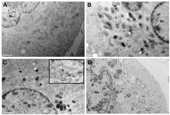Transmission electron microscopy (TEM) analysis of PC-3 cells treated with SeNPs. (A) Electron micrograph of PC-3 control cells (incubation without Se compounds). PC-3 cells after 24 h incubation of sub-toxic concentration of SeNPs-BSA (B), SeNPs-Chitosan with the insert showing a higher magnification of another region of the cytosolic part of the cells (C), and sodium selenite (D). A magnification of ×2900 and a scale bar of 1 µm for all images, and a magnification of ×4800 for the insert with a scale bar of 0.5 µm, have been used. Nu: cell nucleus, m: mitochondria. Cluster of nanoparticles: indicated by the white arrow.