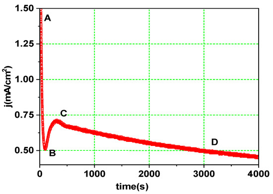The experimental j(t) curve shown in Figure 2 was obtained while preparing the reference sample (TNA_30) with a constant anodization voltage, V = 30 V. The shape of this j(t) plot is dictated by the nature of the electrolyte and the evolution of the oxide layer thickness. Both factors determine the intensity of ion fluxes (Ti4+, O2−, and F−) across the oxide layer [5,6]. Following the voltage switch-on, a rapid jump from 0 to 1.5 mA.cm2 (point A) occurs in the j(t) curve, followed by a nearly exponential decrease (the A-B interval), while a compact barrier oxide layer starts growing on the initially clean Ti metal surface. The current depends on the oxide thickness, d, according to the equation: