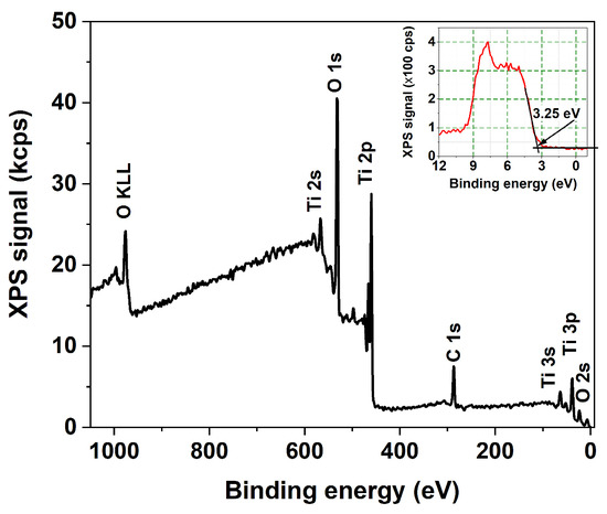 The presence of the C signal in the survey spectra contrasts with the findings of Dronov et al. [24], who reported that, on the exterior of smooth nanotube walls, (i) carbon species are missing within the first atomic layers but rise with depth; (ii) the fluorine signal follows an opposite trend. Our survey spectra of porous wall nanotube arrays revealed a strong carbon signal originating in the first atomic layers. The elemental analysis discrepancies indicate the consequences of differing ion mobility during the preparation of anodized with smooth and porous nanotube walls, respectively. Additionally, the XPS spectra allowed us to derive the valence band maximum level of the layers. It is positioned at 3.25 eV below the Fermi level of the materials, regardless of sample morphology, as seen in the inset of Figure 6, indicating the presence of the highly oxidative anatase phase at the nanotube surface [4,25]. This contrasts with the rutile TiO2 phase, which has a band gap of 3.02 eV and is characterized by lower oxidative power.