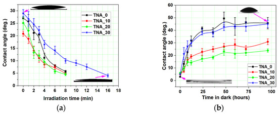 A comparison of the results shown in Figure 9a,b shows that the saturation values of the CA of the samples TNA_0 and TNA_30 after the back-reaction are 15°–20° higher than before the start of photoactivation (Figure 9a), indicating a potential residual photoactivation induced prior to the start of the activation experiments. Moreover, despite having different mechanisms, the wettability and photocatalytic ability follow a similar tendency in the case of TiO2 materials [27]. This can be noticed when comparing the results of the apparently best-performing sample, TNA_10, which features the highest degradation rate and the most rapid surface conversion, but also the slowest evolution of the back-reaction.