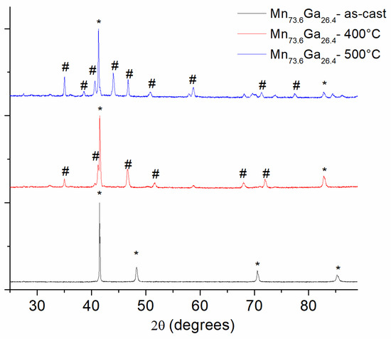 The X-ray diffraction patterns of the as-cast as well as annealed at 400 °C and 500 °C samples. The corresponding symbols are: *—D019, #—tetragonal (L10/D022).