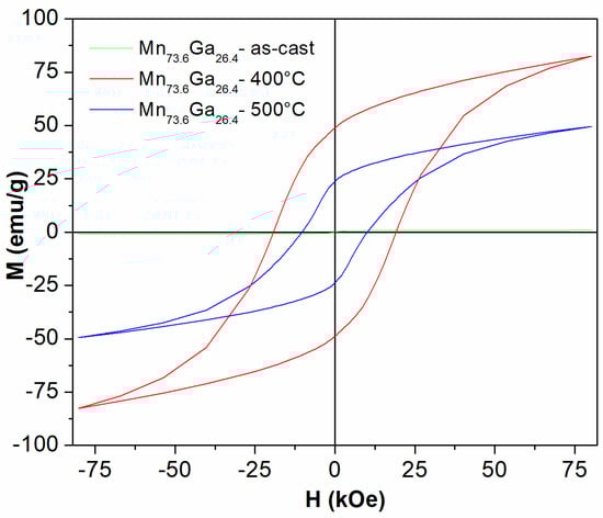 300 K hysteresis loops recorded under an applied field of up to 8 Tesla, for the as-cast MnGa sample, as well as for the samples annealed at 400 °C and 500 °C. The field is applied parallel to the ribbons plane.