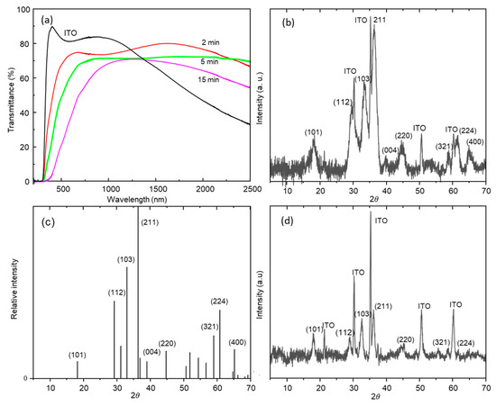 (a) Optical transmittance spectra of the ZnMn2O4/ITO/glass electrodes at different deposition times; (b) XRD pattern of the as-deposited electrode of ZnMn2O4 on ITO corresponding to deposition time of 15 min, (c) XRD standard diffraction pattern of ZnMn2O4 PDF 01-071-2499, (d) 5 min.