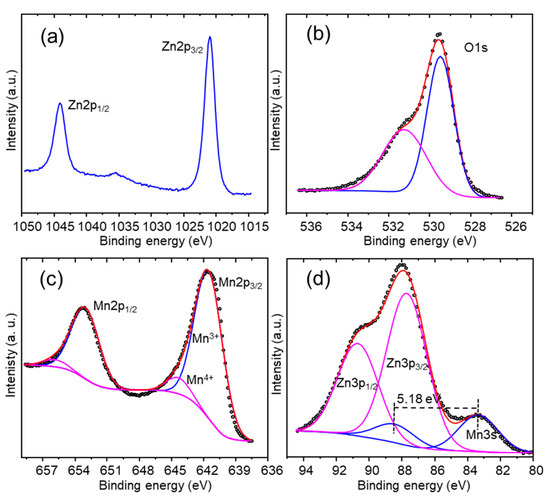 where is the average oxidation state. According to the deconvolution of the Mn2p XPS signal (Figure 4c), the atomic ionic ratio Mn3+/Mn4+ is 10.63, meaning a value of = 3.09, and = 5.18 eV (Equation (6)). This value of = 5.18 eV was used for the deconvolution of the Mn3s signal (Mn3s-Zn3p), which is shown in Figure 4d.