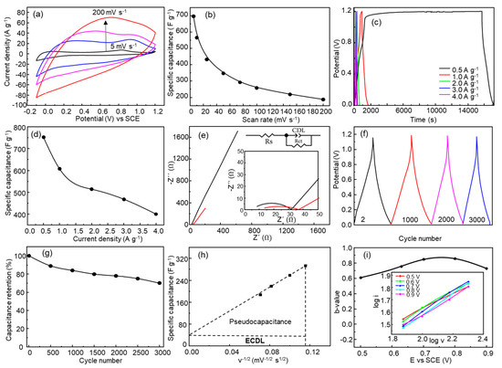 where b is 0.5 for battery-like behavior and 1 for typical EDLC behavior [60]. The representation of log i vs. log v is shown in the inset of Figure 5i, and the values of b are shown in Figure 5i. Figure 5i shows that at the smallest potential, b approaches 0.5, indicating that the diffusion-controlled processes, and battery-like behavior, predominate. However, as the potential increases, b becomes closer to 1, indicating an increase in capacitive contributions related to non-diffusive controlled processes such as EDLC [52,61,62,63].