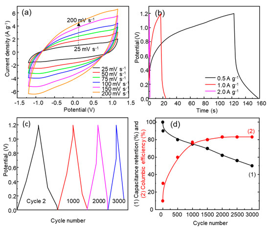(a) Cyclic voltammetry curves with ±1.2 V potential window at scan rates from 25 to 200 mV s−1; (b) GCD at different current densities of 0.5 A g−1, 1.0 A g−1, and 2.0 A g−1; (c) GCD at cycle 2, 1000, 2000, and 3000; (d) capacitance retention and Coulombic efficiency (GCD cycles) for the SSC 1.0 M Na2SO4.