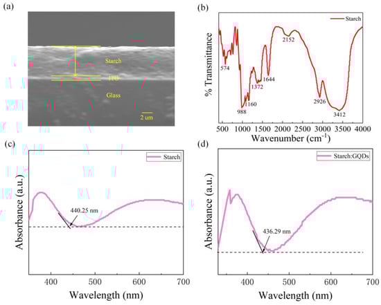 (a) SEM images of starch film cross-section; (b) Fourier transform infrared spectroscopy of starch film. (c,d) Ultraviolet visible absorption spectrum: (c) starch thin film, (d) starch and GQDs composite thin film.