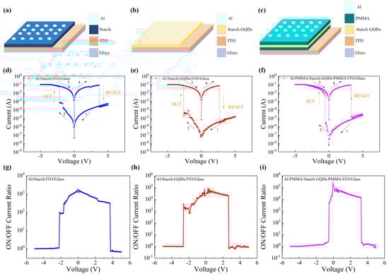 (a–c) Device structure schematic: (a) Al/starch/ITO/glass, (b) Al/starch: GQDs/ITO/glass, (c) Al/PMMA/starch: GQDs/PMMA/ITO/glass. (d–f) I–V characteristics curves: (d) Al/starch/ITO/glass, (e) Al/starch: GQDs/ITO/glass, (f) Al/PMMA/starch: GQDs/PMMA/ITO/glass. (g–i) ON/OFF current ratio: (g) Al/starch/ITO/glass, (h) Al/starch: GQDs/ITO/glass, (i) Al/PMMA/starch: GQDs/PMMA/ITO/glass.