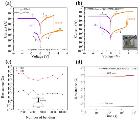 The electrical characteristics of the Al/PMMA/starch: GQDs/PMMA/ITO/PET memristors are shown in Figure 4. Firstly, the behavior of the switching resistor in the current-limiting case was explored, as shown in Figure 4a, where ICC = 10 mA was set in the negative voltage region and ICC = 100 mA was set in the positive voltage region, and the voltage scanning direction was 0 V→−5 V→0 V→5 V→0 V. In the negative voltage region, the device current suddenly increased when the voltage increased to −1.40 V, and the device switched from the HRS to the LRS. In the positive voltage region, when the voltage increased to 3.00 V, the current of the device suddenly decreased and the device reverted to HRS. The device was able to switch between high and low resistive states under a continuous voltage sweep. In order to investigate the flexible performance of the Al/PMMA/Starch: GQDs/PMMA/ITO/PET devices, the electrical characteristics of the devices were tested when they were in the bending state. When the flexible Al/PMMA/starch: GQDs/PMMA/ITO/PET devices (substrate size: 20 mm × 20 mm) were gradually bent from the flat state to a diameter of 16 mm, the devices were still able to operate normally. When bent to a diameter of less than 16 mm, the electrical characteristics of the flexible device were affected. The I–V characteristic curves of the Al/PMMA/starch: GQDs/PMMA/ITO/PET devices were tested under bending, as shown in Figure 4b, and the devices still maintained their bipolar resistive switching behavior. In addition, in order to test its stability after bending, we tested the high and low resistance state distributions of the device after 10,000 bending cycles, as shown in Figure 4c. The results show that the high and low resistance states of the device showed no obvious change after 10,000 bending cycles and had strong stability. In order to investigate the stability of the Al/PMMA/starch: GQDs/PMMA/ITO/PET devices, the resistance values of the high and low resistance states of the devices were read at 1 V DC voltage, as shown in Figure 4d, and the devices’ retention times were more than 104 s.