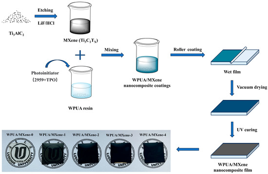 The coating was coated on a glass plate using an RDS 225G# 3/8″ bar coater (R. D. SPECIALTIES Inc., Odessa, TX, USA. and an OCEAN SCIENCE 411 coating machine (OCEAN SCIENCE Co., Ltd., Seoul, Republic of Korea), and the thickness of the wet film was 514.4 μm. Then, the coated glass plate was dried at 60 °C for 6 h under vacuum (−0.08 MPa). After that, UV curing was performed using a ZB300 UV curing equipment (Tai’an Zibor Photoelectric Technology Co., Ltd., Tai’an, China) with a Fusion 300 s UV light source (light intensity of 2.5 W/cm2) to obtain the WPUA/MXene nanocomposite film. The cured film had a thickness of approximately 250 μm. The schematic representation of the fabrication process can be seen in Figure 1.