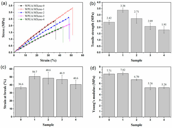 (a) Typical stress–strain curves, (b) tensile strength, (c) elongation at break, and (d) Young’s modulus of the WPUA/MXene nanocomposite films.