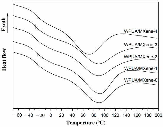 XRD analysis was conducted to investigate the microstructure of the WPUA/MXene nanocomposite films. In the XRD pattern of WPUA/MXene-0 film, only a broad peak appears around 2θ = 20°, indicating the amorphous structure of the polymer. The XRD peaks of the WPUA/MXene nanocomposite films are similar to those of the WPUA/MXene-0 film, without the characteristic peaks of MXene. This may be due to the small amount of MXene added and its uniform dispersion in the matrix, which is not sufficient to form a crystalline phase.
