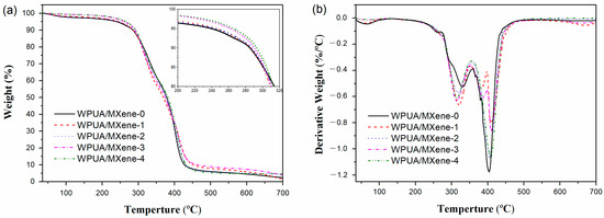 (a) TGA and (b) DTG curves of the WPUA and WPUA/MXene nanocomposites under a nitrogen atmosphere.