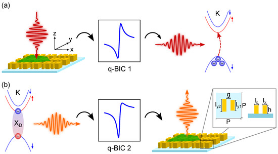 Alternatively, all-dielectric metasurfaces with high refractive indices have emerged as a promising platform to address both challenges simultaneously. Particularly, bound states in the continuum [29,30] (BICs), resonances with theoretically infinite quality factors (Q-factors), offer a straightforward way to tailor the light–matter interaction of various all-dielectric structures. By breaking the symmetry of the system, a radiative channel can be opened, which manifests itself as a leaky mode with a high but finite Q-factor, also called ‘quasi-BIC’. This can be realized by metasurfaces consisting of dielectric meta-atoms with broken in-plane inversion symmetry, where the Q-factor depends on the asymmetry of the unit cell. In addition, their successful combination with TMDs has also been shown recently, e.g., for second-harmonic generation enhancement [31,32].