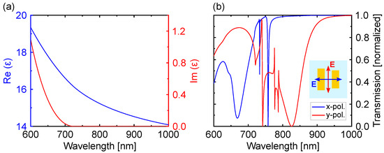 (a) Real (blue curve) and imaginary (red curve) parts of the dielectric permittivity of silicon obtained from ellipsometric measurements. (b) Transmission spectrum of the metasurface under illumination by a plane wave linearly polarized along the x-axis (blue curve) or y-axis (red curve) and propagating along the negative direction of the z-axis. The polarization direction with respect to the unit cell is shown in the inset.