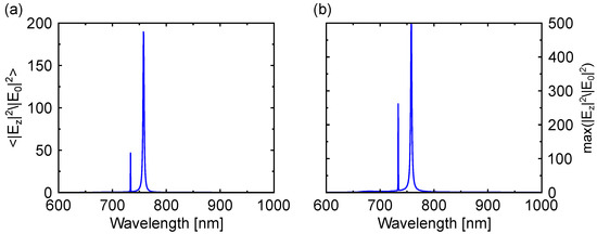 The excitation rate, which can be defined as the rate transition between different energy levels induced by the excitation of incident radiation at a certain wavelength , is proportional to the local intensity enhancement of the incident radiation at the position of the emitter [53]. Taking into account that the 2D material will be seated at the top surface of the nanobars composing the metasurface, we have calculated the electric field intensity enhancement on a surface at from the top of the nanobars. The reason for having the distance between the top surface of the metasurface and the surface plane where the simulations are performed is to consider the fact that the 2D material will be bottom-encapsulated with hBN to avoid possible charge transfer from the silicon metasurface to the TMD, which would result in a spectral shift of the PL emission [54,55]. At that surface, we have obtained the average (Figure 4a) and maximum (Figure 4b) intensity enhancement of the z-component of the electric field. The average has been used with the aim to take into account the different positions of the dipoles in the metasurface. As our objective is to enhance the excitation of out-of-plane dipole moments, we just consider the z-component of the electric field in the calculations. However, it should be noted that for the case of randomly oriented dipoles, the average intensity enhancement must include all the components of the electric field to account for all the possible dipole orientations. From Figure 4, we observe that the intensity enhancement of the z-component of the electric field is the largest at the quasi-BIC resonances, which correspond to the excitation and emission wavelengths of the out-of-plane excitons. According to the description in the PL signal enhancement section, we are interested in the average intensity enhancement at the excitation wavelength (Figure 4a), which corresponds to .