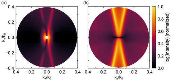 One particularly promising platform to perform all-optical operations is monolayer transition metal dichalcogenides (TMDs) [9]. Such materials are direct bandgap semiconductors [10] whose unique optical properties are largely determined by the extreme 2D spatial confinement and the resulting strong Coulomb interaction. In particular, light–matter interactions are dominated by excitons (strongly bound electron-hole pairs), which are stable at room temperature due to their high binding energy of several hundred meV [11,12,13]. Excitons can be further distinguished between optically allowed (“bright”) and optically forbidden (“dark”) [14]. To understand the existence of both species, a closer look at their band structure is necessary. The aforementioned direct band gap in TMD monolayers lies at the corners of the hexagonal Brillouin zone, the K and K’ points (or valleys), respectively, which are energetically degenerate but nonequivalent due to their different selection rules [15]. The strong spin–orbit coupling results in massive spin splitting in the valence band (on the order of several hundred meV) and much smaller splitting in the conduction band (a few tens of meV) [13]. To fulfill spin–momentum conservation, only transitions between bands with the same dominant spin direction are optically allowed (bright) in the electric dipole approximation and with emission in the out-of-plane direction. Such bright excitons possess short lifetimes (a few ps) and are therefore ideal for sensing applications or fast light-emitting diodes [16,17,18]. In contrast, spin-forbidden dark excitons have a much longer lifetime and coherence time [19], as radiative recombination can only occur through a spin-flip [20], leading to the possibility of manipulating the system’s valley degree of freedom numerous times. The control of this spin-valley degree of freedom is a prerequisite for all-optical valleytronic devices [21] and holds great promise for all-optical information processing. However, the generation and detection of spin-forbidden dark excitons is challenging due to their zero in-plane dipole moment [22,23]. In recent years, several endeavors have been undertaken to achieve the brightening of dark excitons. Conventional approaches involve the application of strong in-plane magnetic fields [24,25], out-of-plane polarized surface plasmon polaritons [26], or the injection of out-of-plane polarized light [27]. These methods primarily amplify the excitation of dark excitons, whereas their efficient detection remains a problem due to the out-of-plane dipole-like radiation pattern that they exhibit. Current research focuses on employing objectives with large numerical apertures (NA) to tackle this issue [27,28].