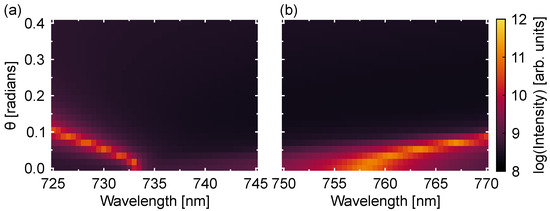 Angle-dependent intensity spectra for x-axis polarized light at the spectral regions corresponding to the (a) excitation and (b) emission wavelengths of the dark excitons. The intensity is calculated from the z-component of the electric field at a plane 10 nm above the metasurface and is represented in logarithmic scale. The angle is fixed to .
