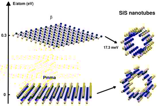 Inorganic nanotubes have atracted significant attention since the discovery of WS nanotubes in 1992 [1], followed by other examples such as MoS [2] and imogolite nanotubes [3]. Furthermore, inorganic boron nitride nanotubes have been synthesized experimentally [4,5], exploiting their isoelectronic nature to carbon nanotubes. Then, researchers have explored a wide range of materials for nanotube formation, including various transition metal dichalcogenides (TMDCs), as well as compounds consisting of three or four elements, such as misfit layered compounds [1,6,7,8]. These misfit compounds consist of alternating slabs of hexagonal layered compounds, such as disulfides, and monosulfides in other structural phases. As the development of two-dimensional materials continues, the search for new materials that can be rolled into nanotubes is ongoing [9,10,11,12,13,14]. Recently, phosphorene layers were discovered, and the corresponding nanotubes have already been studied [9,10,15]. The next potential candidate layers to be investigated seem to be the two-dimensional materials isoelectronic to phosphorene, such as those based on silicon-sulfide SiS [16,17,18]. Several two-dimensional silicon monosulfide layers have been reported [16,17,18], which can be simplified into three monolayer structures and two thicker, more stable structures. Of these, two monolayer hexagonal structures were found analogous to the black and blue phosphorus bulk [16,19], while the third has a rombohedral unit cell that was shown to be stable [18]. Thicker SiS nanolayers have also been investigated [17], revealing very stable phases such as Pmma structures, followed by silicene ones being both cubic structures. We aimed here to investigate the properties of one-dimensional SiS nanotubes by rolling the two key bi-dimensional SiS nanostructures, as shown in Figure 1.