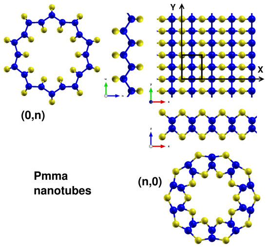 The rectangular unit cell used to roll the Pmma layer and build the nanotubes is depicted in Figure 2, with examples of the initial geometries for the (n,0) and (0,n) Pmma nanotubes. Some of the (n,0) tubes with small curvature experienced large deformations during structural relaxations, having significant reconstructions into silicene-like layers, as discussed in Appendix A.1. Moreover, the relaxed structures of (n,0) tubes are less stable than those of the (0,n) tubes. For instance, the energies per atom for nanotubes (n,0) with a radius around 7.1 Å are at least 50 meV/atom higher than for the (0,n) counterparts. Therefore, we focused our discussion on the SiS nanotubes (0,n), as they maintain their initial structure after rolling the Pmma layer, and the structural relaxations converge smoothly to the final ground-state geometries.