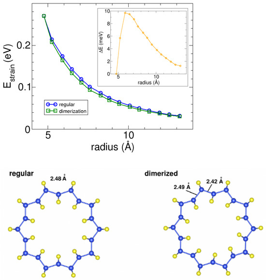 Furthermore, the (0,n) nanotubes after relaxations can exhibit two distinct structures for each size, with energy differences of a few meVs per atom. We observed two curves for the SiS nanotubes (0,n) corresponding to regular and dimerized structures. The inset of Figure 3 illustrates that the dimerized nanotubes are more stable than the regular ones by 1–10 meV per atom. In the regular structures, the distance between silicon atoms across the cross-section is constant, while in the dimerized nanotubes, the silicon–silicon distances alternate between short and long distances across the tube. This dimerization effect is small, with differences of 0.03–0.07 Å between the silicon–silicon distances across the tubes. The effect starts at a radius of 5 Å, reaches a maximum, and then decreases for larger radii. In addition, we carried out molecular dynamics simulations that confirm the stability of the (0,n) nanotubes in the phase at room temperature. Further details on these simulations are provided in Appendix A.2.