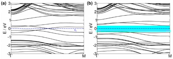 The band structure of the (6,6) SiS nanotube is shown in Figure 9a,b. Although the (6,6) nanotube is a semiconductor, its band gap is indirect with a value of 1.17 eV. The valence bands are degenerated at the X point of the Brillouin zone and split as they approach the point. In contrast, the (16, 0) bands (included in Figure A7) have a direct band gap of 1.64 eV at the point, and the bands are nearly flat close to the Fermi energy.