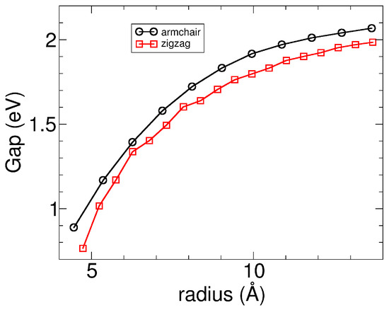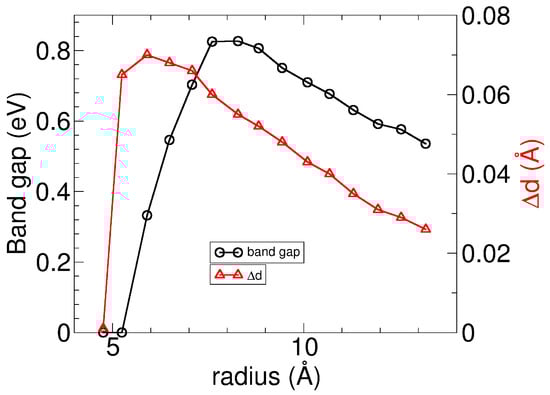 The Si–Si dimerization has a significant impact on the electronic structure of SiS nanotubes. As shown in Figure 4a, the band structure of a regular (0,n) nanotube reveals that around the Fermi energy, the hole bands are mainly localized in the Si–S–Si and Si–Si bonds, becoming unoccupied, while the electron bands of Si dangling bonds are partially occupied. The two bands cross the Fermi energy at an intermediate point, making the regular (0,n) nanotubes metallic. However, the Si–Si dimerization opens a non-negligible gap in the electronic structure of the regular (0,n) nanotubes, as shown for the dimerized SiS nanotube in Figure 4b, and the dimerized nanotubes turn into semiconductors. Using PBE is acceptable, but it is reported to underestimate the gap [32,33]. Note that the gap opening due to dimerization happens even when we use hybrid functionals, as discussed in Appendix B. The variation of the band gap of the dimerized SiS nanotubes as a function of the tube size is displayed in Figure 5. The band gap increases with the radius, reaching a maximum value before decreasing monotonically. The maximum in the band gaps is shifted to a larger radius than the maximum in the geometry dimerization, indicating that the gap opens after the dimerization in distances. Appendix A.3 includes additional details on the analysis of the projected density of states in atoms, given for the dimerized (0,10) nanotube. As expected, sulfur contributes with s states at deep energies and with p states at higher energies. Silicon atoms also have s states at deep energies and p states near the Fermi energy and show a non-negligible overlap with d states due to the nanotube curvature. It should be noted that the p–d Si hybridization is negligible in the Pmma layer.