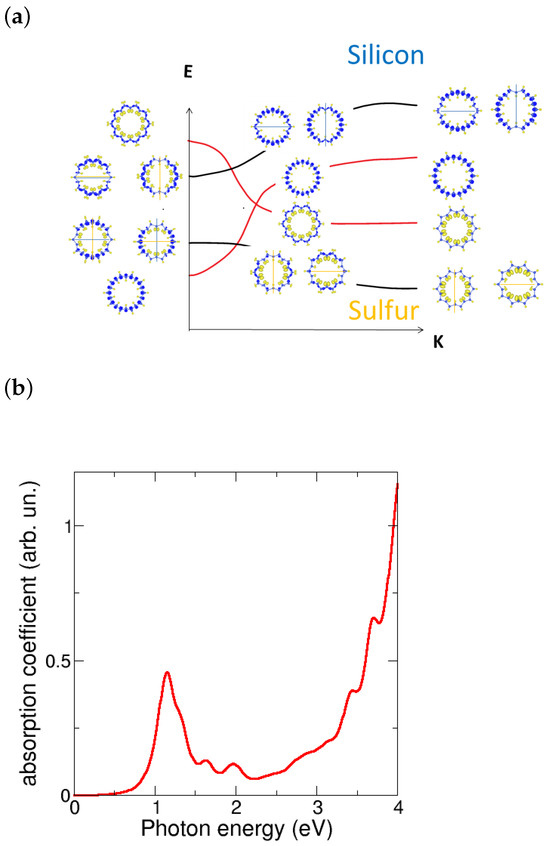 (a) Scheme of partial charge densities decomposed in bands and sites at selected k points (0, 0.5, 1 from left to right) along the regular (0,10) tube. The bands around the Fermi energy exhibit different symmetries, characterized by the presence or absence of nodal planes. The bands near the Fermi energy without nodes exhibit different characters of sulfur and silicon, which become mixed due to the Si–Si dimerization and the gap opening. (b) Calculated absorption coefficient for the (0,10) dimerized nanotube. It is worth noting the significant absorption observed in the UV–visible range, along with a prominent peak responsible for emission in the infrared range.