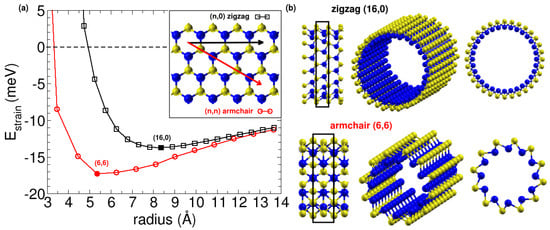 Our initial calculations for SiS nanoribbons indicated that the corresponding nanotubes could potentially be stable. Upon relaxation of the atoms, the SiS nanoribbons were found to curve spontaneously, with the larger S atoms located on the outside and the smaller Si atoms on the inside. Therefore, we further investigated the stability of the SiS nanotubes by rolling the SiS layer into two types of chiralities—armchair (n,0) and the zigzag (n,n), as shown in the inset of Figure 7a. We compared the energy per atom of the relaxed nanotubes with that of the flat phase. The strain energy per atom ( ) for both armchair and zigzag nanotubes is shown as a function of the average nanotube radius in Figure 7a. The strain energy is found to be negative below that of the monolayer for increasing average nanotube radius. This finding indicates that the SiS nanotubes are more stable than the monolayer due to their spontaneous curvature, a phenomenon that has been also observed and studied in imogolite nanotubes [3,12,13].