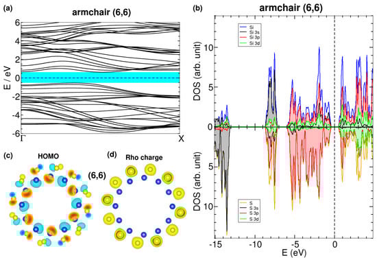 We next examined additional noteworthy electronic properties of the (6,6) minimum. Figure 9c shows the highest occupied molecular orbital (HOMO) for the (6,6) nanotube. It has p-type lobes on the sulfur atoms and sp lobes localized on the silicon ones, a localization in Si that is consistent with the projected density of states shown in Figure 9b. Finally, in Figure 9c,d, we observed the charge density for the (6,6) nanotube, with electrons being positioned around the sulfur atoms in the outer part of the nanotubes. The SiS nanotubes have a positive charge inside and a negative charge outside, following a pattern that might have practical applications. For example, by using electric fields, these tubes could be manipulated for electronic transport in the valence (outer) or conduction (inner) band, as discussed similarly for the photovoltaic proposals developed in imogolite nanotubes [35].