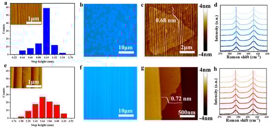 Step height distribution and the growth results of monolayer MoS2 on LSS and HSS. Statistics on the step height of LSS (a) and HSS (e). OM images of MoS2 on LSS (b) and HSS (f). AFM images of MoS2 grown on LSS (c) and HSS (g). Raman spectrum of MoS2 on LSS (d) and HSS (h).