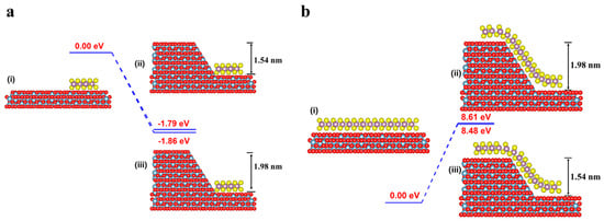 CP2K calculations of the growth. (a) Energy profiles of MoS2 on a flat surface (i) attached to a 1.54 nm-high step (ii) and a 1.98 nm-high step (iii). (b) Energy profiles of MoS2 on a flat surface (i) crossing a 1.54 nm-high step (ii) and a 1.98 nm-high step (iii), respectively. The binding energies of MoS2 on a flat surface are set as energy references.
